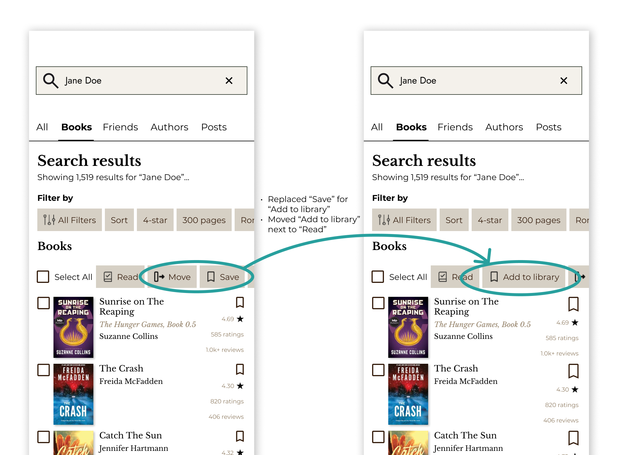 • Participants were confused with the wording of the “Save” button in the bulk actions section. It wasn’t clear that this button would add a book to their library.